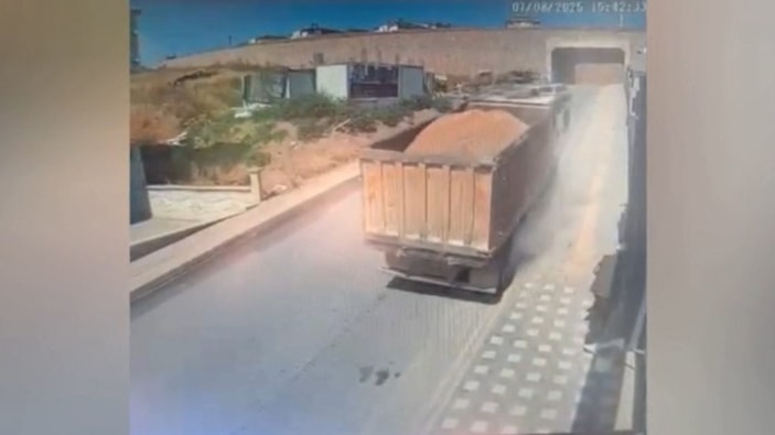Kontrolden çıkan kamyon, bir sitenin bahçe duvarına çarparak devrildi. O anlar çevredeki güvenlik kamerasına yansırken, kaldırımda bulunan bir kişi kamyonu son anda fark ederek kaçarak ezilmekten kurtuldu.