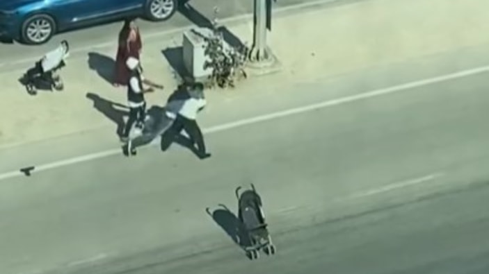 Tekme tokat kavga sırasında bebek arabalarından biri, orta refüjden yola inip ilerlemeye başladı.