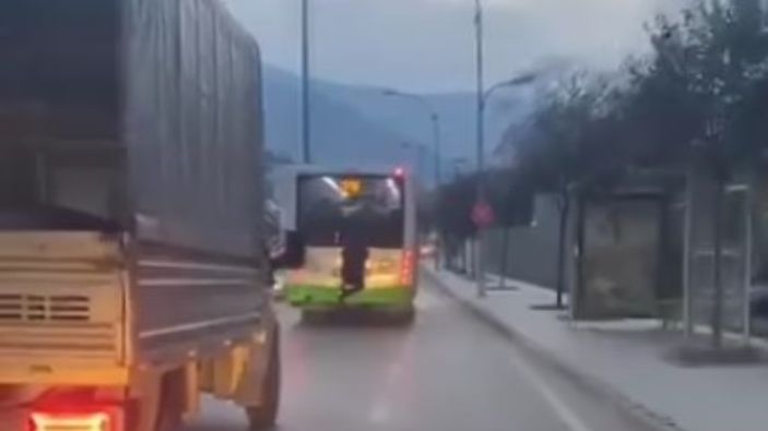 Ardından ise bir genç, seyir halindeki halk otobüsünün arka tamponuna tutunarak gizli yolculuk yaptı.