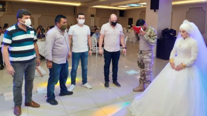Gelinlik giyen eşi ile el ele tutuşarak salona giren Arslan'ı askeri üniforma içinde gören davetliler, şaşkınlık yaşadı.