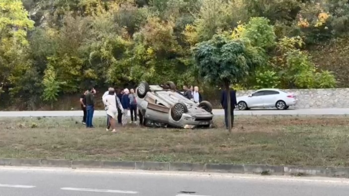 Yağışlı havanın etkisiyle savrulan araç, orta refüje çarpıp takla attı.