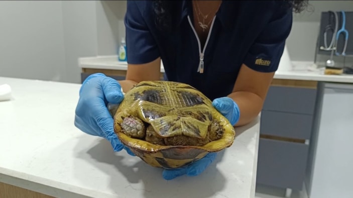 Vücudunda geniş yanık izleri tespit edilen kaplumbağa, hemen veteriner kliniğine götürülerek tedaviye alındı.