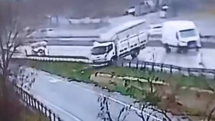 İstanbul Büyükçekmece'de yağışlı hava nedeniyle sürücüsünün direksiyon hakimiyetini kaybettiği kamyon, önce yan şeritte ilerleyen panelvana ardından bariyerlere çarparak kaza yaptı.