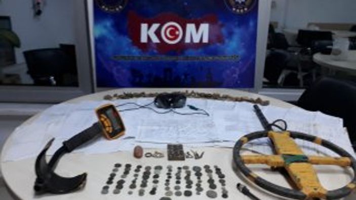 Adrese yapılan başarılı operasyon sonrası; 81 adet tarihi eser niteliği taşıdığı değerlendirilen sikke, 1 adet metal arama dedektörü, 143 adet farklı boyutlarda metal obje, 1 adet üzerinde Osmanlıca ibareler olduğu değerlendirilen yüzük, 1 adet 5 santimetre uzunluğunda yumurta formlu kiremit parça, 6 adet çivi ve cımbız görünümlü metal obje, 1 adet 5x9 santimetre boyutunda ve üzerinde figür bulunan obje ile 26 adet harita ve işaretlerin not kağıtları ele geçirilerek, malzemelerin tamamına el konuldu. Konuyla ilgili şüpheli şahıs E.T., yakalanarak gözaltına alındı.
