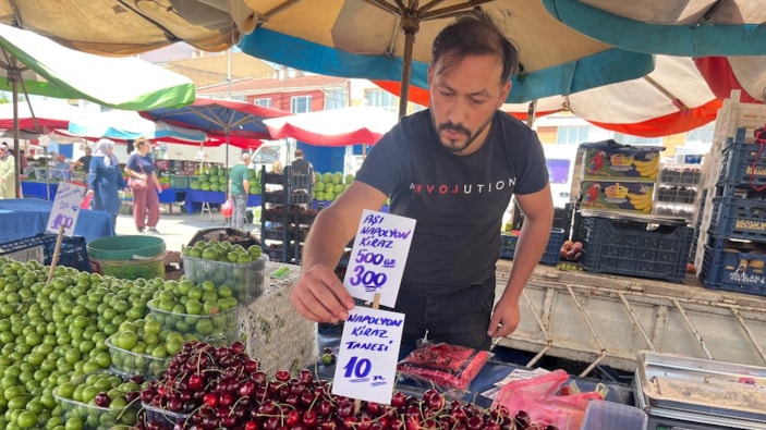 Eskişehir'de semt pazarı esnafı İlker Çiçek, vatandaşların tadımını azaltmak için tezgahına "Kirazın tanesi 10 TL" yazılı etiket koydu.