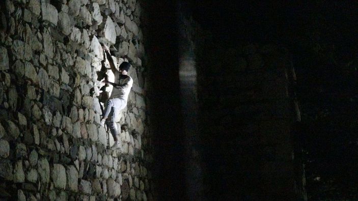 Kaleye gelen polis ekibi sur taşlarına tutunarak tırmanan kişinin 8 metre yüksekliğe kadar çıktığını fark etti.