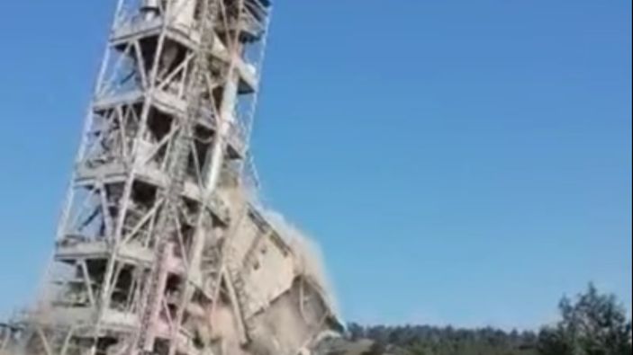Belediyenin satın aldığı çimento fabrikası arazisinde, çelik kulelerin saniyeler içinde ekipler tarafından yıkılma anı, cep telefonu kamerasına yansıdı.