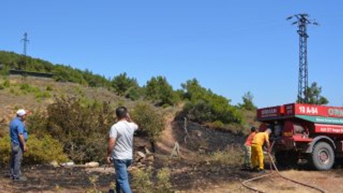 Enerji nakil direğinden çıkan yangında makilik alan zarar gördü.