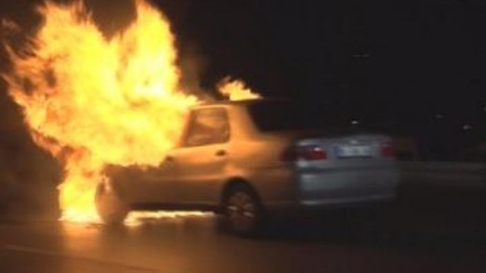 Nurçeli araçtan indikten sonra araç, alev topuna döndü.