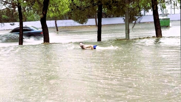 Aslında benim yaptığım bir ironidir. Denizli'deki tüm mahallelerde, sokaklarda ve caddelerde 100 yıllık bir altyapı olduğunu söylediler. Ben sırf bu yüzden, altyapı sorunlarını farklı bir yaklaşımla göstermek için bu şekilde suya girerek video çektik. Bunu planlamadık, su baskınlarıyla birlikte bir anda kendiliğinden gelişti. Sosyal medyada paylaştığımız videonun altına ‘deli' diye yorum yapmışlar. Deli de değilim. Kendim yüzme antrenörüyüm, yolun hali açıkça ortada. Yoldan karşıdan karşıya geçmeyi bırakın, arabalar yolda ilerleyemiyor. Denizli'nin altyapısı işte gözler önünde.