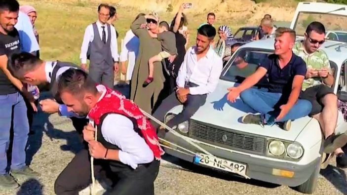 1 tonluk otomobili iple 50 metre çekmeyi başaran damat ve sağdıcın o anları saniye saniye kaydedildi.