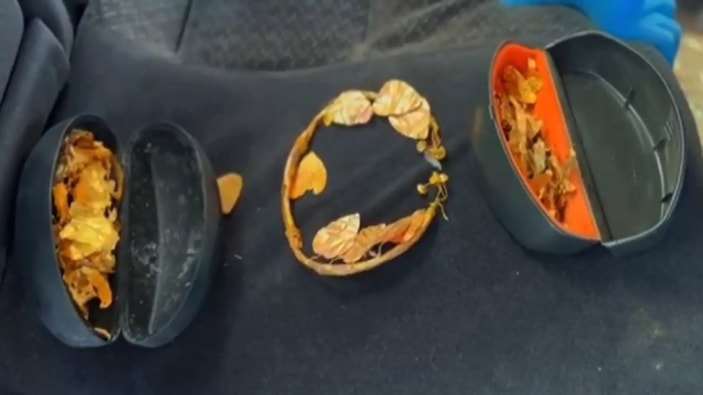 Denizli'de gözlük kutusu içine gizlenmiş şekilde Helenistik döneme ait olduğu değerlendirilen 70 gram ağırlığında altın taç bulundu. Tarihi eserin paha biçilemez kral tacı olduğu belirtilirken gözaltına alınan 2 şüpheli tutuklandı.