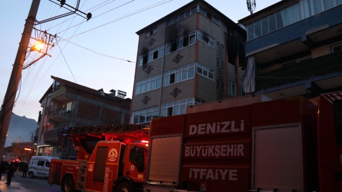 Pamukkale ilçesinde sobadan çıkan yangında 2 çocuğu dışarı çıkmayı başadan ve 1 yaşındaki çocuğunu da 4. kattan vatandaşların açtığı battaniyenin üzerine atarak kurtaran anne hayatını kaybetti.