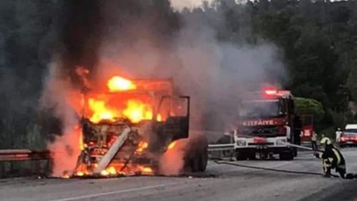 Sürücü kamyonu durdurup araçtan indikten saniyeler sonra alevler kısa sürede büyüyerek kamyonu sardı.