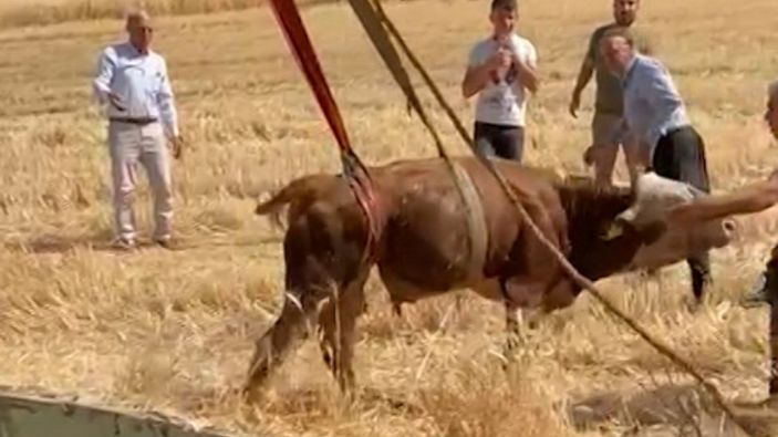 İş makinesi ile yukarıya çekilen boğanın kurtarılma anları kameraya yansıdı.