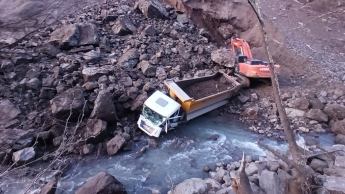Heyelan nedeniyle kopan kaya ve toprak parçaları iş makinesi ile kamyonun üzerine düştü.