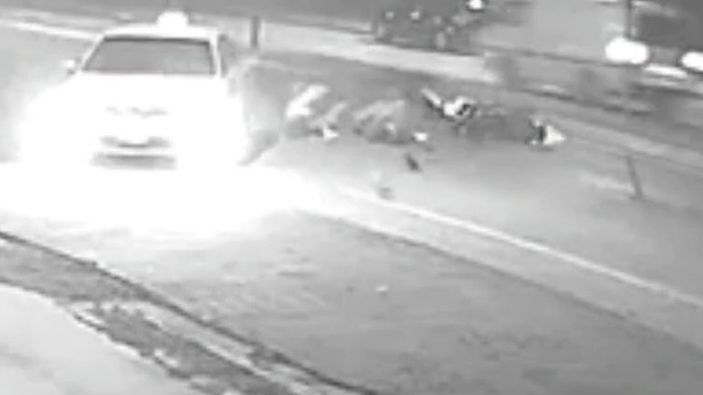 Düzce'de taksinin çarptığı motosikletin sürücüsü ile yanındaki kişi yaralandı. Kaza anı güvenlik kamerasına yansıdı.