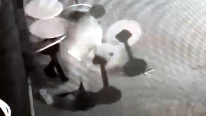 Görüntülerde, alkollü olduğu görülen bir kişinin gece saatlerinde iş yerinin önüne geldiği, kişinin dükkan önüne bırakılan masaya oturduğu yer aldı.