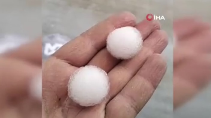 Bir işçi, yere düşen dolu tanelerini toplayıp videoya çekti.
