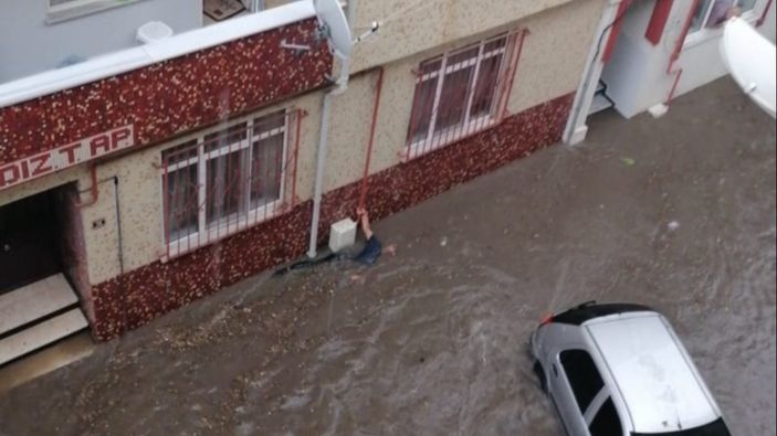Yoğun yağış sonrası meydana gelen sele kapılmamak için doğal gaz borusuna tutunan genç elektrik akımına kapıldı. Yoğun bakımda tedavisi devam eden gencin o anları kameraya yansıdı.