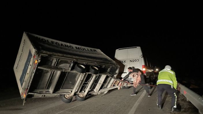 Yan yatan römork nedeniyle trafikte aksama yaşandı, ekipler trafiği tek şeritten sağladı.