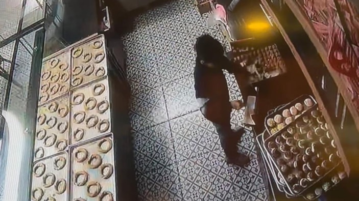 Görüntülerde; çocuğun işletmeye girdiği, kasadan para aldığı, baklava yediği ve yaş pasta paketlediği anlar saniye saniye güvenlik kameralarına yansıdı.