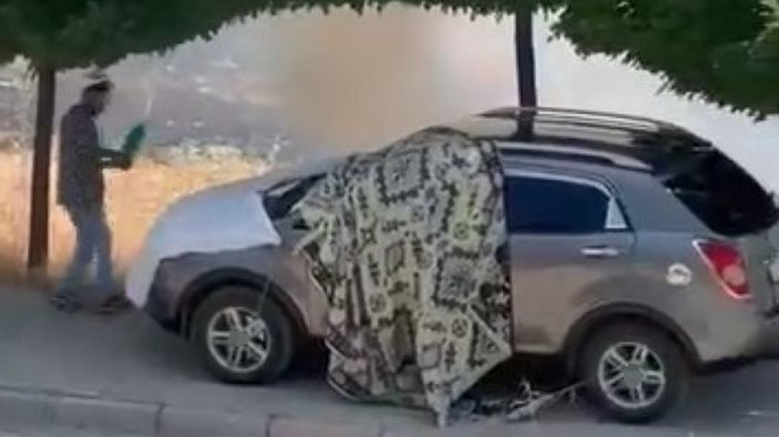 YANGINI FARK EDEN GENÇLER, ARACIN ÜZERİNİ ÖRTÜP ISLATTI