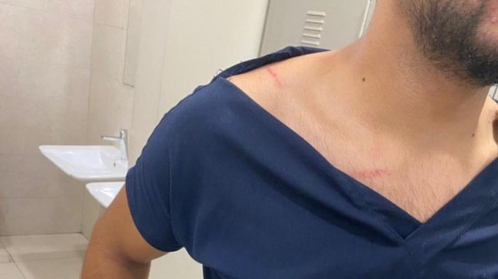 Üniforması yırtılan ve omzu çizilen sağlık personeli, kendisine saldıranlardan şikayetçi oldu.