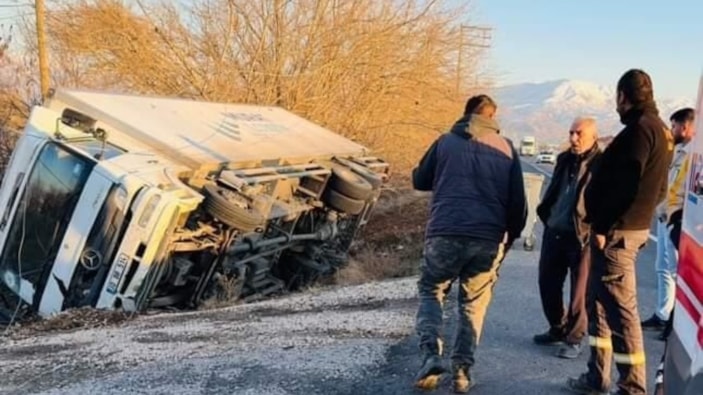 Elazığ’da sürücüsünün direksiyon hakimiyetini kaybettiği kamyon yoldan çıkıp yan yattı. Kazada sürücü yaralandı.