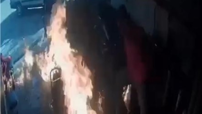 Tamir sırasında motosiklette çıkan yangına yanlışlıkla yanıcı maddeyle müdahale eden 2 kişi alevlerin arasında kaldı. Yaralanan olmazken, olay güvenlik kamerasına yansıdı.