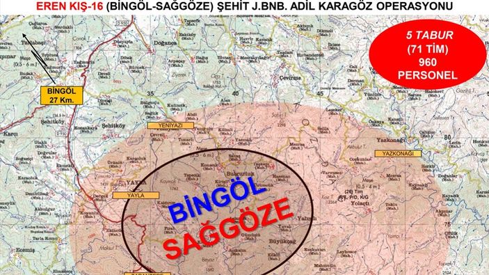 Bakanlıktan yapılan yazılı açıklamaya göre, halen kış üstlenmesindeki teröristleri 'ara-bul-yok et' taktiğiyle etkisiz hale getirmek, başta eylem olmak üzere her türlü hazırlıklarını boşa çıkarmak ve bölgedeki huzur güven ortamını pekiştirmek amacıyla, Bingöl'de 'Eren Kış-16 Bingöl-Sağgöze Şehit Jandarma Binbaşı Adil Karagöz Operasyonu' başlatıldı.