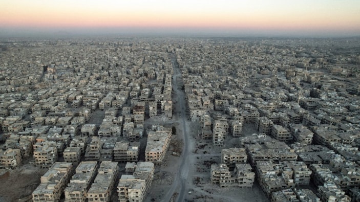 Rejim güçlerinin varil bombalarıyla saldırdığı kampta, tüm binalarda savaşın yıkıcı izleri dikkat çekiyor.