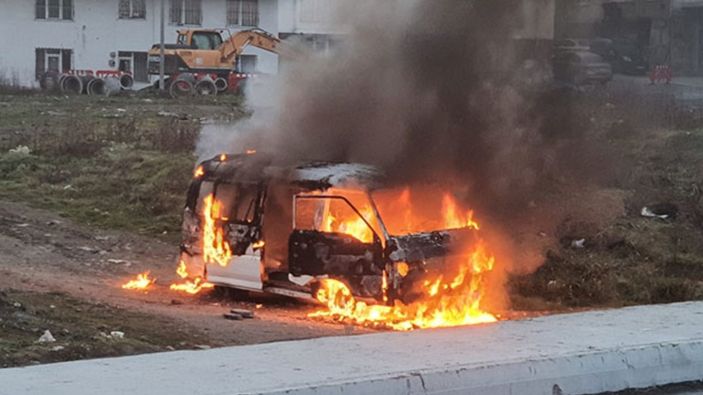 İstanbul'un Esenyurt ilçesi Selahattin Eyyübi Mahallesi'ndeki boş araziye minibüsünü park eden kişi, aracını ateşe verdi.