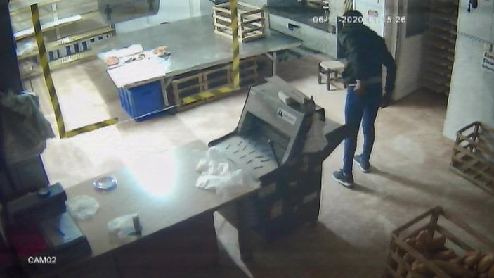 Fırındaki çalışanların işlerini yaptığı ve dükkanla ilgilenmediğini fark eden hırsız, tezgahın arka tarafına geçerek dolapları karıştırmaya başladı.