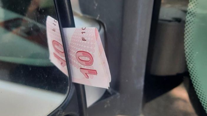 Ticari aracının sol ayna ve alt tampon kısımlarının kırıldığını fark eden Güler, ardından aracın aynasına sıkıştırılmış 10 TL ve sileceğine bırakılan notu gördü.