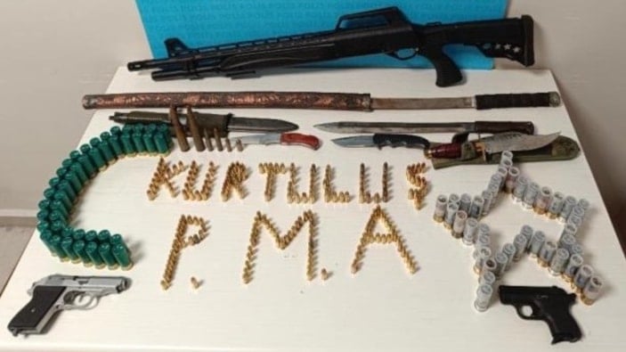 Şahsa ait iş yerinde yapılan aramada 2 adet ruhsatsız tabanca, 1 adet ruhsatsız av tüfeği, 296 adet fişek, 2 adet boş kovan, 2 adet mermi çekirdeği, 5 adet bıçak ve 1 adet kılıç ele geçirildi.