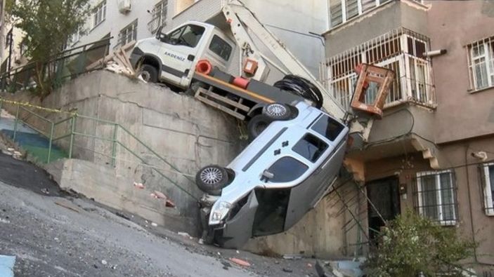 Kayarken çarptığı park halindeki hafif ticari araç istinat duvarından aşağı düştü. Bakım onarım aracı duvarda asılı kaldı. Hafif ticari aracın düştüğü yerde bulunan Elif Göğüs, yanındaki çocuğunu da çekerek son anda kaçabildi.