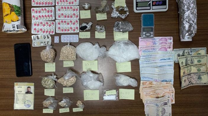 Şüphelinin yanında bulunan poşette arama gerçekleştiren ekipler, meyve suyu kutusuna gizlenmiş halde 199 gram kubar ele geçirilirken, O.M'nin evinde yapılan aramalarda, 113,9 gram kubar, 204,5 gram metamfetamin, 19,30 gram Afgan macunu, 4 gram kokain, bin 866 adet uyuşturucu hap, 2 adet hassas terazi ele geçirildi