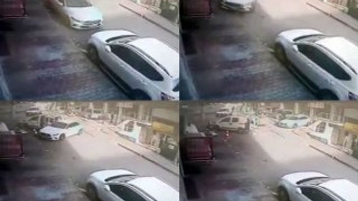 Bir anda hızlanan otomobil, geri geri gelerek park halindeki bagaj kapısı açık olan bir araca çarptı. Hızını alamayan otomobil, kaldırıma çıkıp binanın duvarına çarparak durabildi. Kaldırımda oturan bir genç, aracın kendisine doğru geldiğini fark edince hemen ayağa kalkarak kaçtı.