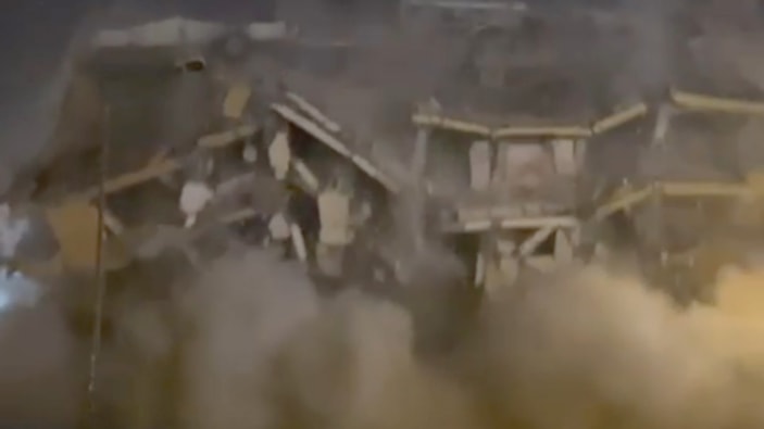 İslahiye ilçesinde 6 Şubat 2023 depremlerinde hasar gören 6 katlı bina, kontrollü yıkım sırasında aniden çöktü.
