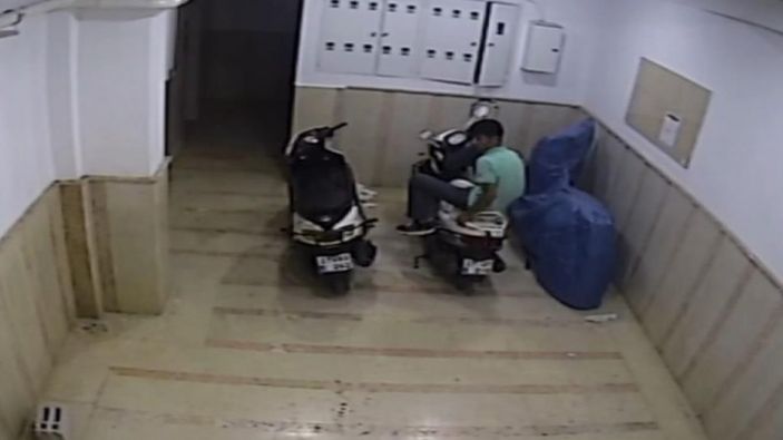 Motosikletleri fark eden iki hırsız, etrafta yaptıkları keşfin ardından sırayla apartmana girdi.