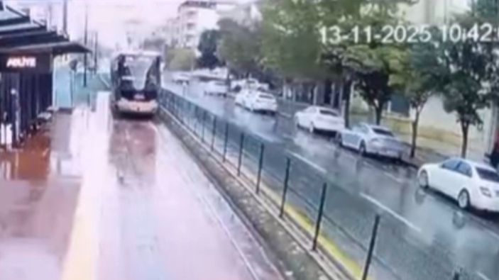 Hareket halindeki tramvaya yıldırım isabet etme anları ise duraktaki güvenlik kameralarına yansıdı.