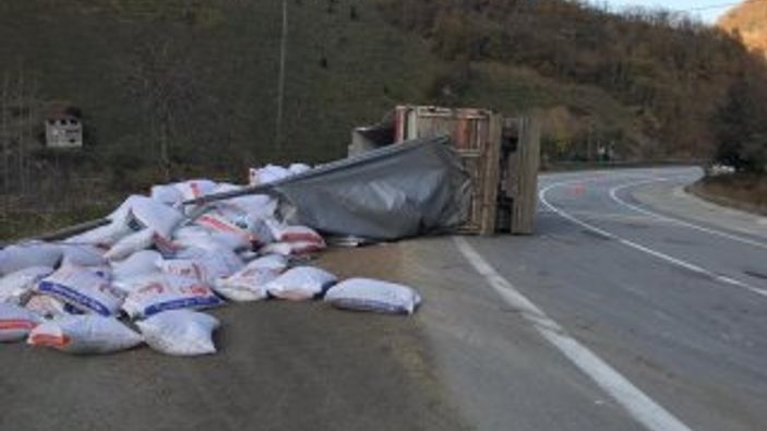 Giresun’un Tirebolu ilçesinde Eymür Köyü mevkiinde Bilal U. yönetimindeki 25 SE 519 plakalı yem yüklü tır Doğankent istikametinden Tirebolu istikametine seyir halinde iken sürücüsünün direksiyon hakimiyetini kaybetmesi sonucu yoldan çıkarak devrildi.