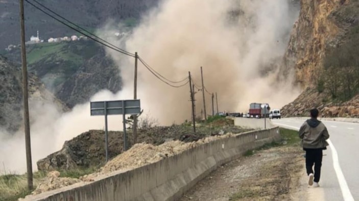 Gümüşhane-Tirebolu karayolunda meydana gelen ve büyük bir gürültüyle gerçekleşen heyelan kameralara yansıdı.