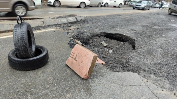Yetkililer bir süre gelmeyince cadde üzerinde bulunan esnaflar çukurun etrafına araç lastiği ve taşlar koyarak önlem almaya çalıştı.