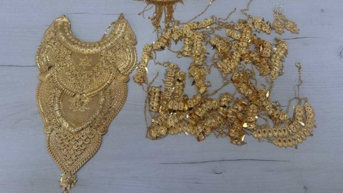 Gümrük görevlileri, sürücü koltuğunun arkasındaki yolcu valizinde, kıyafet ve kişisel eşyalar yerine yüzük, kolye, küpe, bilezik ve madalyon gibi sarı ve beyaz metallerden yapılmış çok sayıda paket buldu.