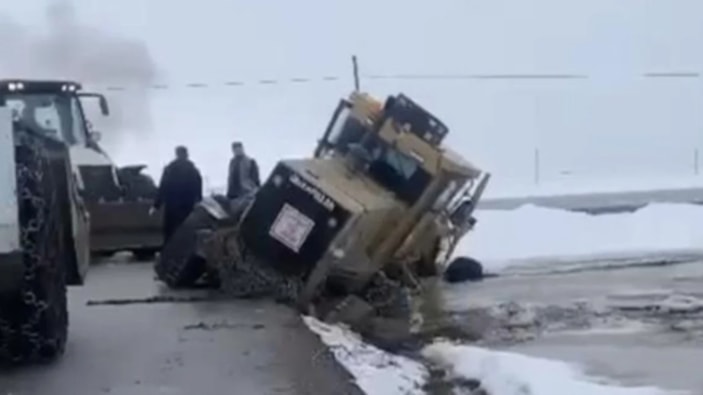 Bugün sabah saatlerinde yol açma çalışmaları için yola çıkan iş makinesi, ilçenin Altınoluk köyü yakınlarında seyir halinde olduğu sırada yol kenarındaki boşluğa düştü.
