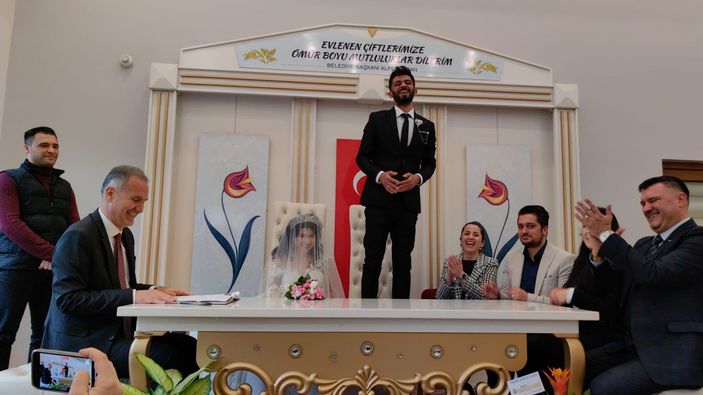 Çiftin nikahını İnegöl Belediye Başkanı Alper Taban kıyarken, damat Mustafa Girente ilçe adetlerine göre sandalyenin üzerine çıkarak ‘Evet’ yanıtını verdi.