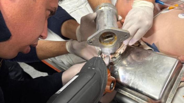 İhbar üzerine hastaneye giden ekipler, çocuğun elinin sıkıştığı kıyma makinesini kurtarmak için hastane yatağında çalışma başlattı.