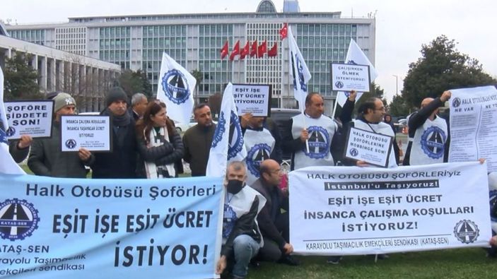 KATAŞ-SEN, İBB'nin Saraçhane'deki binası önünde eylem yaparken KATAŞ-SEN Başkanı Şahin Başaraner, "Asgari ücretle çalıştırdığınız bu şoförlerin hakkını yiyorsunuz" dedi.